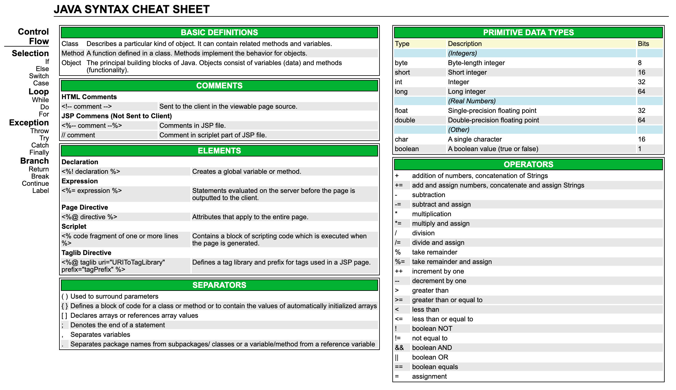 Don't forget to bookmark Java Cheat Sheet using Ctrl + D (PC) or Command + D (macos). If you are using mobile phone, you could also use menu drawer from browser. Whether it's Windows, Mac, iOs or Android, you will be able to download the images using download button.